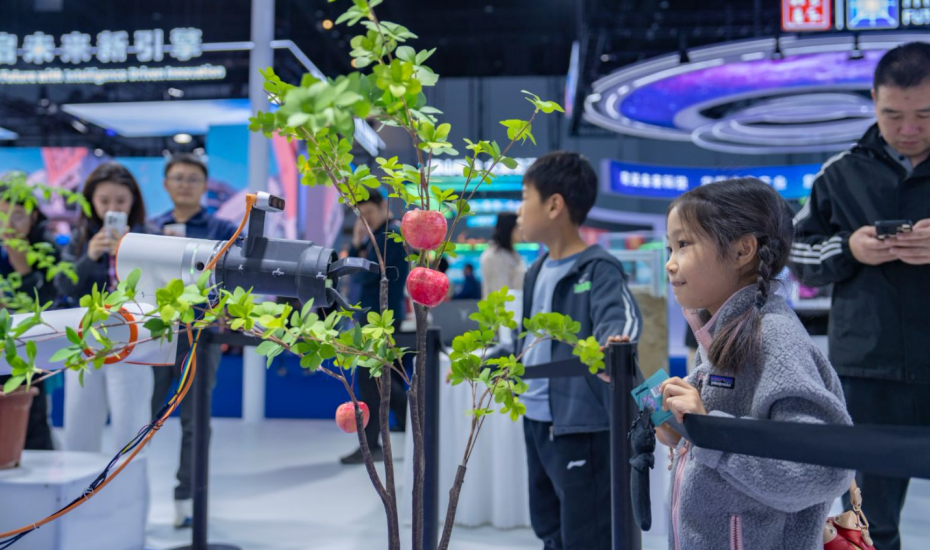 “吉儿”旁边的智能采摘机器人则可以在果树林中精准识别果实,并将其采摘、搬运至指定位置。“可以通过更换采摘末端实现对不同尺寸作物的采摘,也可以通过升降台实现对高度不同作物的采摘。”中国科学院自动化研究所工作人员郝骏宇介绍。