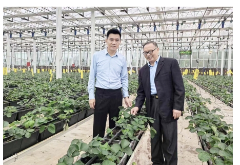 金果小镇负责人范俊辰(左)和农技专家查看空中草莓长势