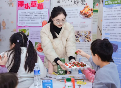 “认识与品鉴溧水地理标志产品”环节成为现场参与者的“味觉盛宴”。活动设置了品鉴专区,色泽鲜亮、果香浓郁的溧水草莓被整齐摆放,孩子们有序品尝,纷纷赞叹“溧水草莓又甜又多汁”。在江苏商标品牌研究中心工作人员陆颖的细致讲解下,孩子们了解到溧水草莓之所以能成为地理标志产品,离不开当地独特的土壤条件、气候环境以及严格的种植标准,更明白了知识产权保护对保障产品品质、提升品牌价值的重要作用,让抽象的地理标志保护理念在味觉体验中落地生根。