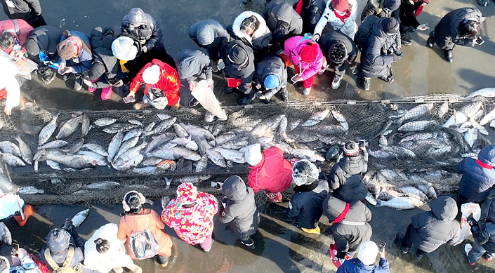 近日,以“雪映肇东·福鱼献瑞”为主题的肇东库塘沐第八届冬捕渔猎文化节在黑龙江绥化肇东市涝洲镇库塘沐湖畔举办。近万名游客从五湖四海汇聚而来,踏雪寻鱼、共赴盛会,沉浸式体验传统民俗与现代欢乐交织的冬日盛宴,见证肇东冷水渔业振兴成果,感受“冰天雪地”向“金山银山”的转变。